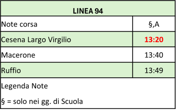 • La corsa scolastica di linea 94 A in partenza alle 13:15 da Cesena Largo Virgilio diretta a Ruffio è posticipata di 5 minuti, nuovo orario di partenza 13:20.