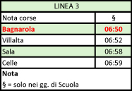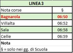 Informiamo che, da lunedì 2 febbraio, la corsa scolastica di linea 3 in partenza da Bagnarola alle 6:55 diretta a Celle viene anticipata di 5 minuti, nuovo orario 6:50.