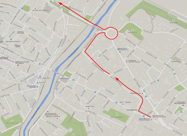 • Da p.zza Bologna direzione v. Bertoni: raggiunta l’intersezione tra via Forlivese e via De Gasperi percorre; via De Gasperi – rotonda XXV aprile – v.le Rosselli – v.le delle Ceramiche, poi percorso ordinario.