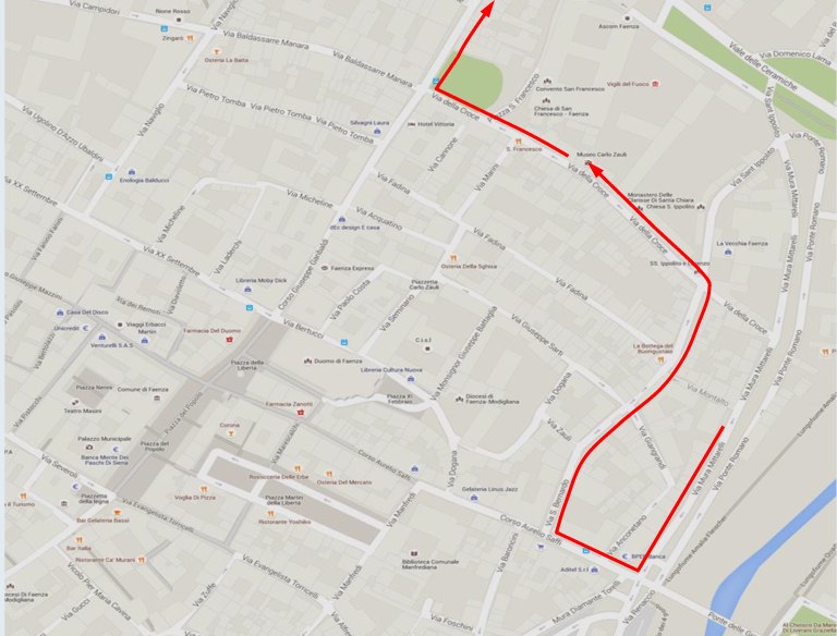 • Da Piazza Bologna in direzione Via Bertoni: percorre via Mura Mittarelli, Corso Saffi, via S. Bernardo, via S. Ippolito, via della Croce, Corso Garibaldi e poi riprende il percorso regolare in direzione Stazione FS/Via Bertoni.