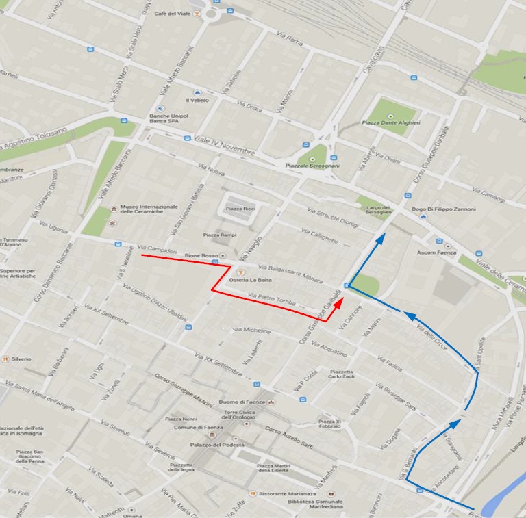 • da Piazza Bologna per v. Bertoni (linea blu): raggiunta l’intersezione tra corso Saffi e via S. Bernardo, il percorso prosegue lungo via S. Bernardo – via S. Ippolito – via della Croce – corso G. Garibaldi, per poi riprendere il percorso ordinario.