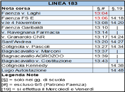 • Viene istituita una nuova corsa feriale scolastica da Faenza FS (E) alle 14:18 per Cotignola, Lugo (Autostazione) effettuata il mercoledì e venerdì.