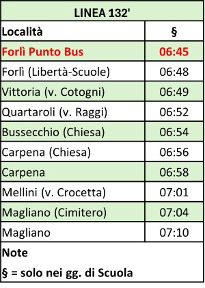 • La corsa scolastica in partenza da Forlì punto bus alle 6:55 in direzione Magliano viene anticipata di 10 minuti, osserva il nuovo orario di partenza delle ore 6:45.
