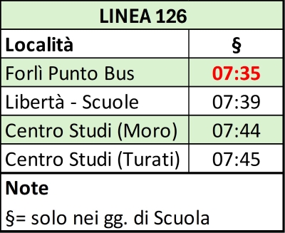 • La corsa scolastica in partenza da Forlì punto bus alle 7:40 in direzione centro studi (Turati) viene anticipata di 5 minuti (nuovo orario 7:35).