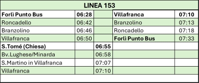 • La corsa feriale in partenza da Forlì Punto Bus alle 06:33 diretta a Villafranca viene anticipata di 5 minuti (nuovo orario 6:28);