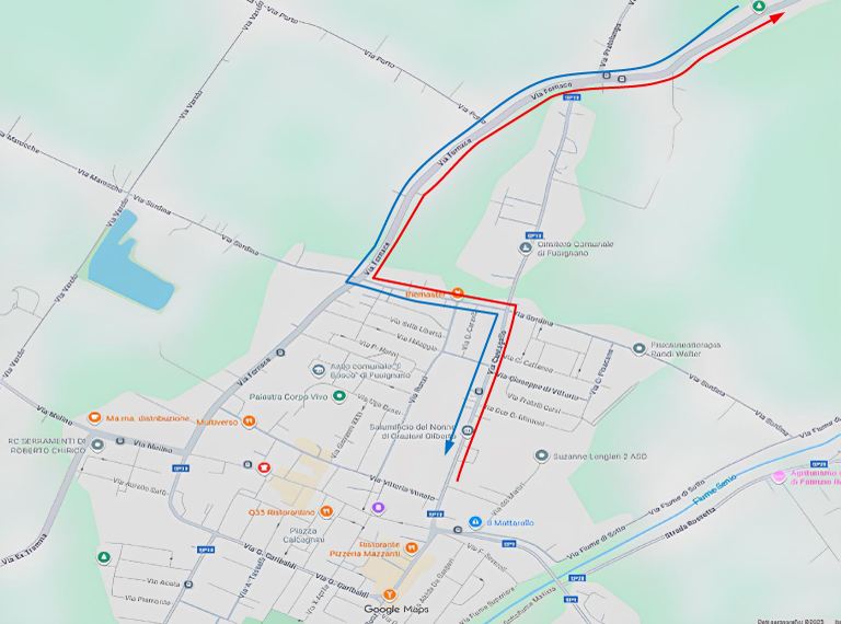 • Da Alfonsine per Lugo (linea blu): a San Savino raggiunta l’intersezione tra via Stroppata/via Fornace e via Cantagallo percorrono via Fornace – via Sordina – via Cantagallo e riprendono il percorso regolare.