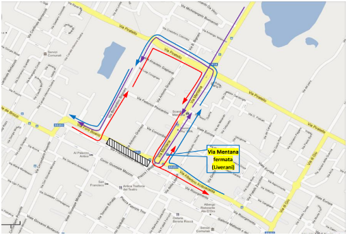 • Corse provenienti da via Acquacalda in direzione Strada Provinciale 253 (linea blu): via Mentana – via Piratello – via Brignani, poi riprendono il percorso regolare.