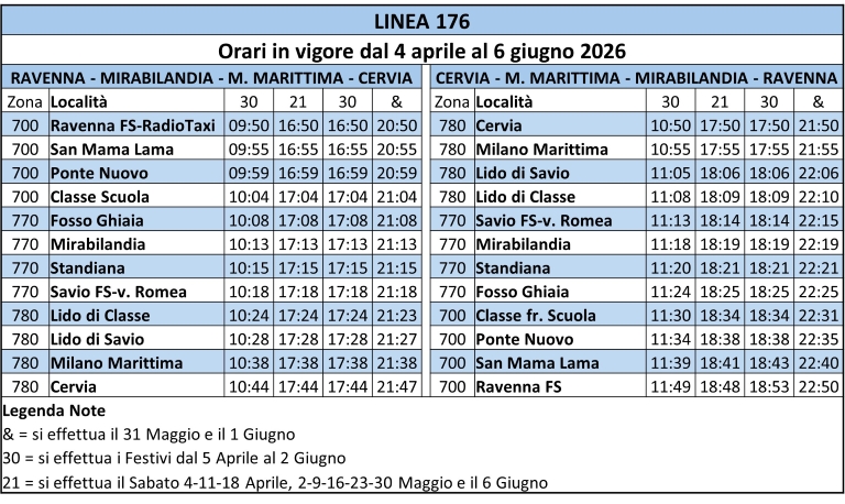In occasione dell’apertura primaverile del parco divertimenti Mirabilandia, da sabato 4 aprile a sabato 6 giugno viene potenziato il servizio di linea 176.