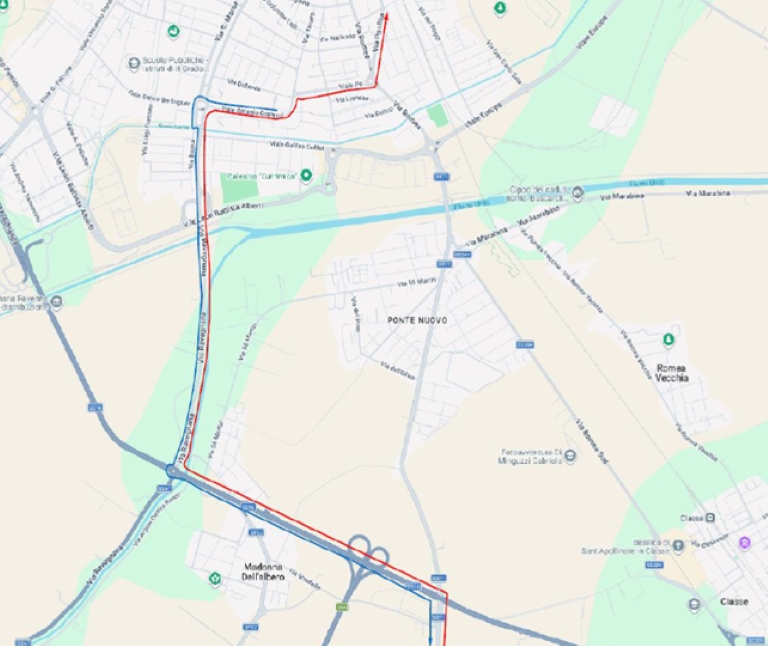 • da Cesena/Ravenna-Marcegaglia (linea rossa): la corsa delle ore 20:40 a Ravenna raggiunta l’intersezione tra via Dismano e la SS16 via Classicana percorre, SS16 via Classicana (dir RA) – via Ravegnana – rotonda Irlanda – v.le Gramsci – v.le Po, poi percorso ordinario.