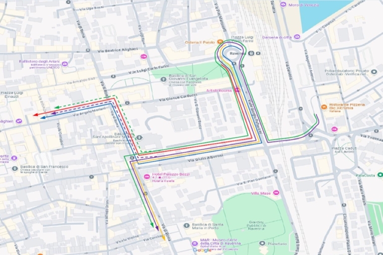 • Corsa delle 12:50 da p.le A. Moro: da p.le A. Moro percorrono, via Candiano – v.le Pallavicini – Stazione FS – effettua inversione di marcia alla rotonda p.zza L. C. Farini – v.le Pallavicini – via Alberoni – via di Roma – via Mariani e riprende il percorso regolare.