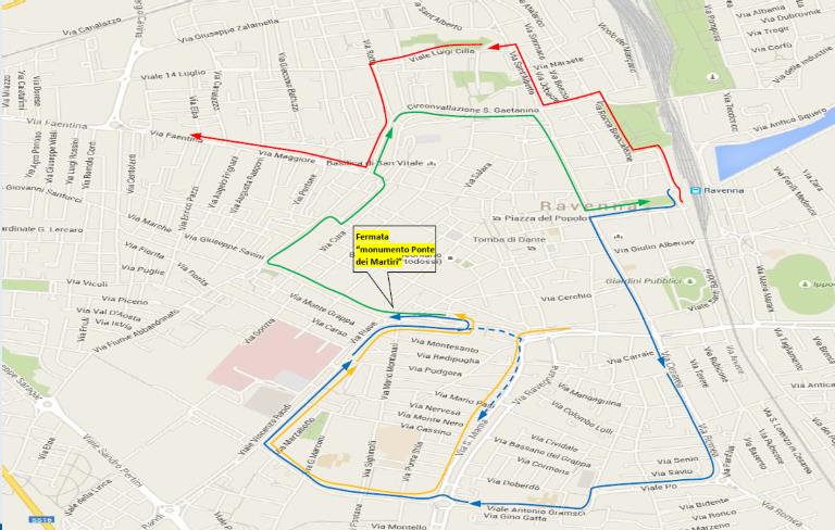 • Dal centro in direzione Stazione FS (linea verde): raggiunta l’intersezione tra circ.ne al Molino e via Augusta percorrono, circ.ne al Molino – (effettuano la fermata “monumento Ponte dei Martiri” in circ.ne al Molino) – circ.ne al Molino – via Fiume Abbandonato – via Oberdan – v.le Baracca – p.zza Baracca – via Maggiore – circ.ne S. Gaetanino – via S. Alberto – via di Roma – v.le Farini, poi riprendono il percorso ordinario.