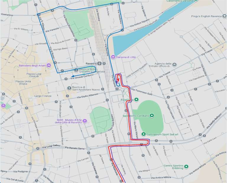 • da Ravenna FS-RadioTaxi per circ.ne p.zza D’Armi (linea blu): Ravenna FS-RadioTaxi – via Carducci – via di Roma – v.le Farini – via Rocca Brancaleone – circ.ne alla Rotonda dei Goti – via Darsena – p.zza Caduti sul Lavoro, per poi riprendere il normale percorso.