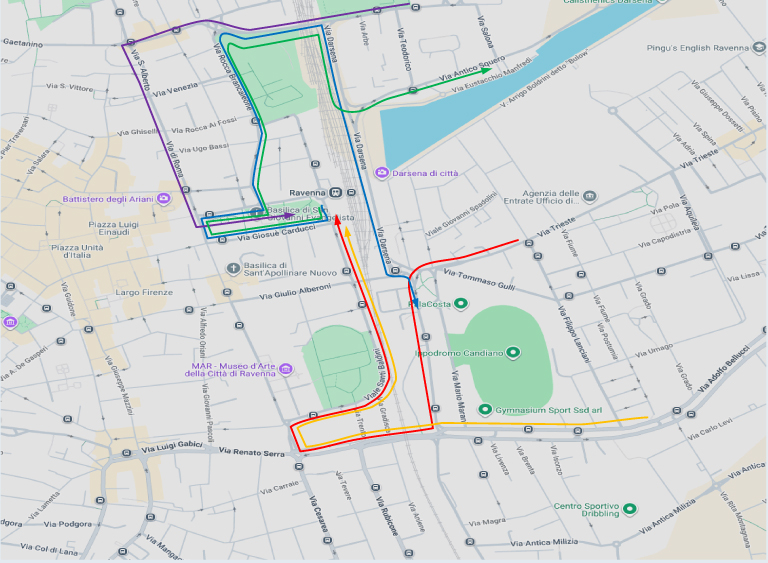 • da Cesena per Ravenna-p.le A. Moro (linea rossa): a Ravenna raggiunta l’intersezione tra v. Rubicone e v. Canale Molinetto percorre: v. Rubicone – circ. Canale Molinetto – v. Destra Canale Molinetto – circ. P.zza D’Armi – v. Candiano – p.zza Caduti sul Lavoro – via Magazzini Anteriori – p.le A. Moro.