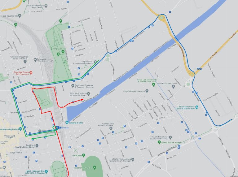 • Provenendo dai Lidi per Ravenna FS (linea blu): raggiunta in via Destra Canale Molinetto la “rotonda Francia” percorre, v.le Europa – rotonda Finlandia – v. Monti (ponte mobile) – rotonda Belgio – v. delle Industrie – rotonda Cipro – v. delle Industrie – circ.ne alla rotonda dei Goti – v. di Roma – v.le Farini – Ravenna FS.