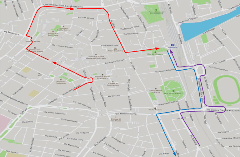 • Da Cesena/Ravenna (linea rossa): raggiunta a Ravenna via Rubicone percorre via Rubicone – circ.ne Canale Molinetto – circ.ne piazza D’Armi – piazza Caduti sul Lavoro – via Candiano – via Magazzini Anteriori – piazzale Aldo Moro.