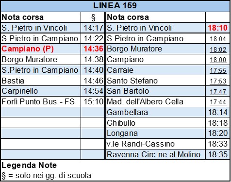 • La corsa feriale scolastica delle 14:41 da Campiano per Forlì Punto-Bus FS viene anticipata di 5 minuti (nuovo orario 14:36).