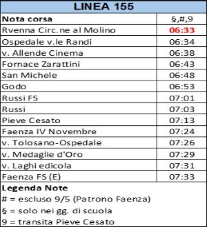 Informiamo che, da mercoledì 7 gennaio, la corsa feriale scolastica della linea 155 delle 6:38 da Ravenna circ.ne al Molino per Faenza FS (E) viene anticipata di 5 minuti da Ravenna circ.ne al Molino fino a Russi FS (nuovo orario 6:33).