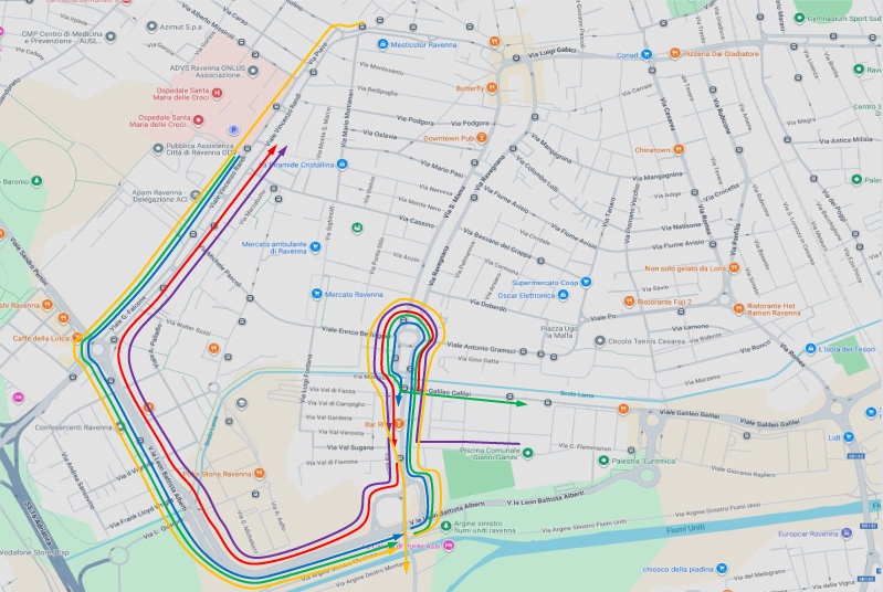• Da via Falconieri per Ravenna FS (linea viola): raggiunta la rotonda Irlanda in via Ravegnana percorre, via S. Mama – via Ravegnana (a dx uscita per v.le Alberti) – v.le Alberti – v.le Randi, poi percorso ordinario.