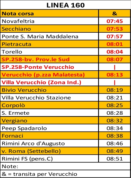 • La corsa festiva in partenza da Novafeltria alle 07:53, diretta a Rimini, viene anticipata di 8 minuti (nuovo orario 07:45) e transiterà da Verucchio p.zza Malatesta.