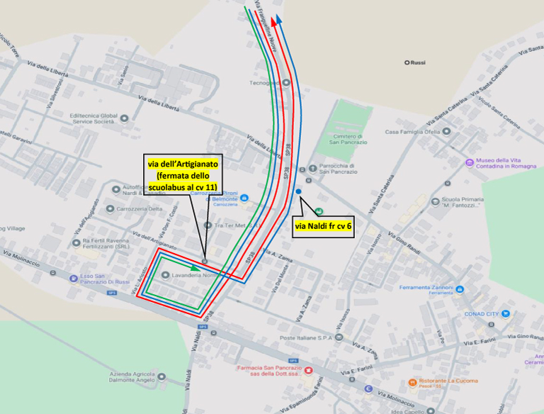 • La corsa delle 16:00 da Ravenna per San Pancrazio (linea verde): a S. Pancrazio, raggiunta l’intersezione tra via Franguelline Nuove e via Randi percorre, via Naldi, via Molinaccio (dir Russi), via Ariosto, via dell’Artigianato, poi riprende il percorso ordinario.