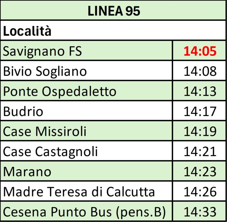 Informiamo che, da lunedì 13 ottobre la corsa feriale di linea 95 in partenza da Savignano FS alle ore 14:20 in direzione Cesena Punto bus è anticipata di 15 minuti, nuovo orario di partenza alle ore 14:05.