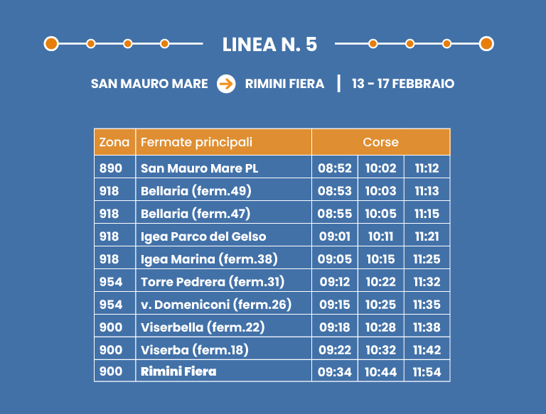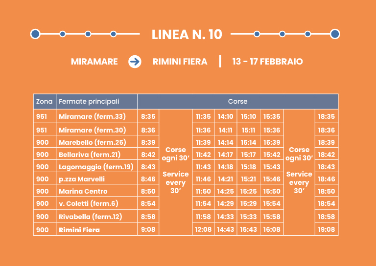 Collegamento rapido su corsia dedicata. Interscambio con Linea 9 a Rimini FS.