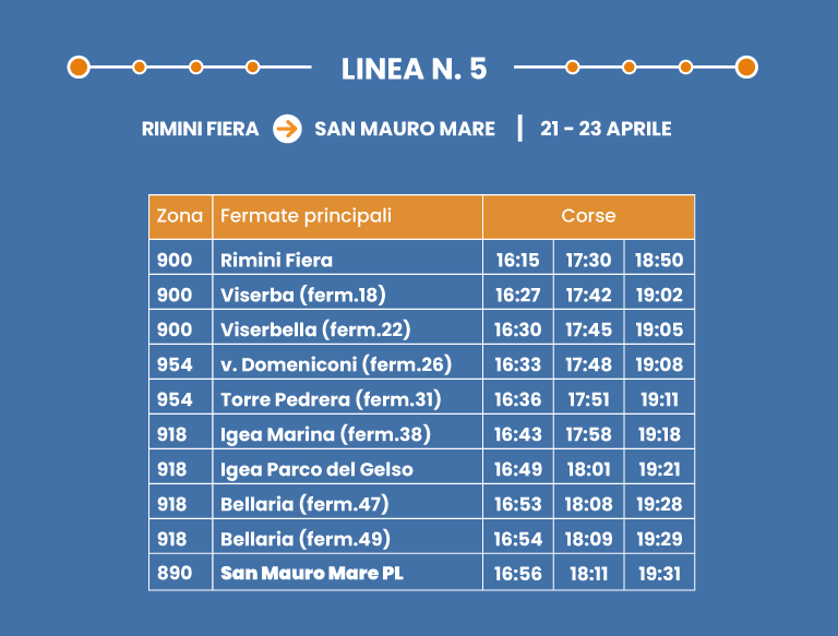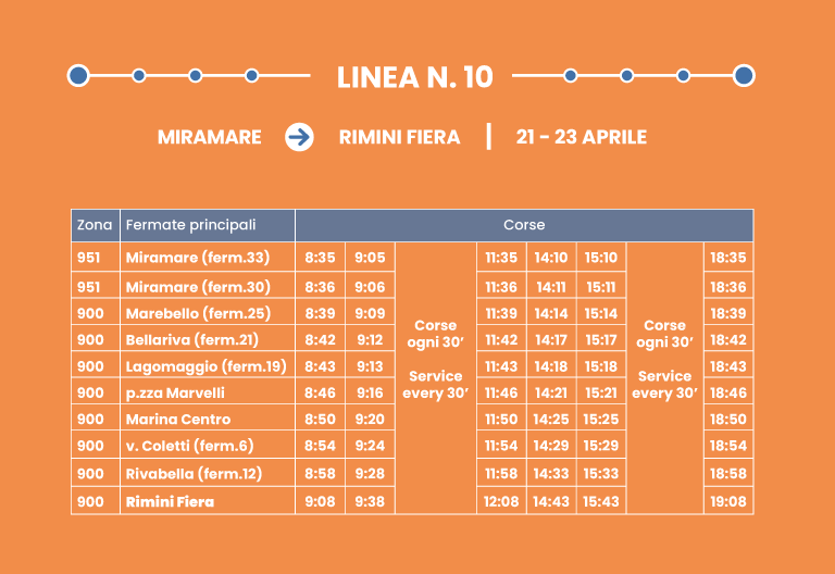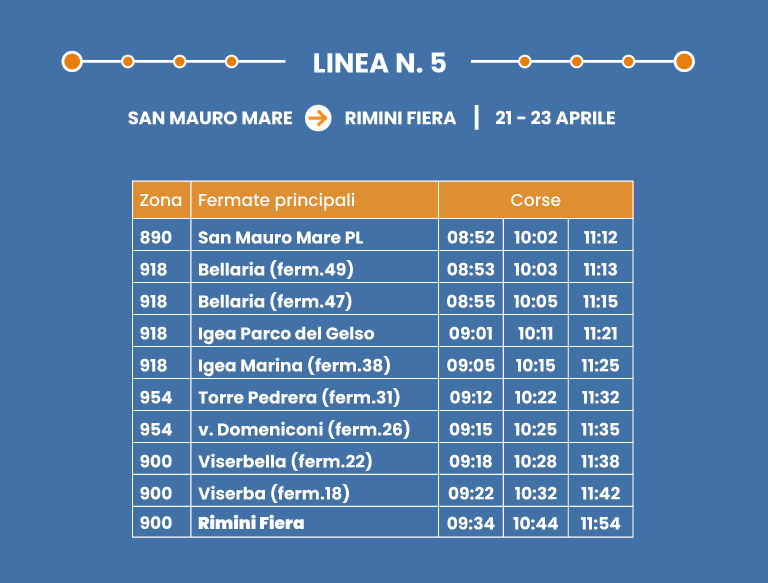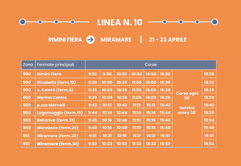 Collegamento rapido su corsia dedicata. Interscambio con Linea 9 a Rimini FS.