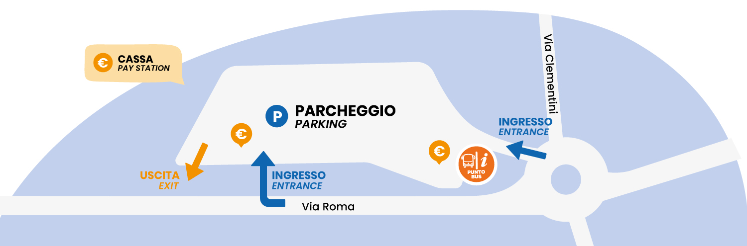 - L’ingresso principale al parcheggio è su Via Roma, in prossimità dell’uscita. Chi proviene da sud deve utilizzare la rotonda del Punto Bus per invertire il senso di marcia e svoltare a destra dopo il distributore di benzina, seguendo la segnaletica verso il parcheggio Clementini.