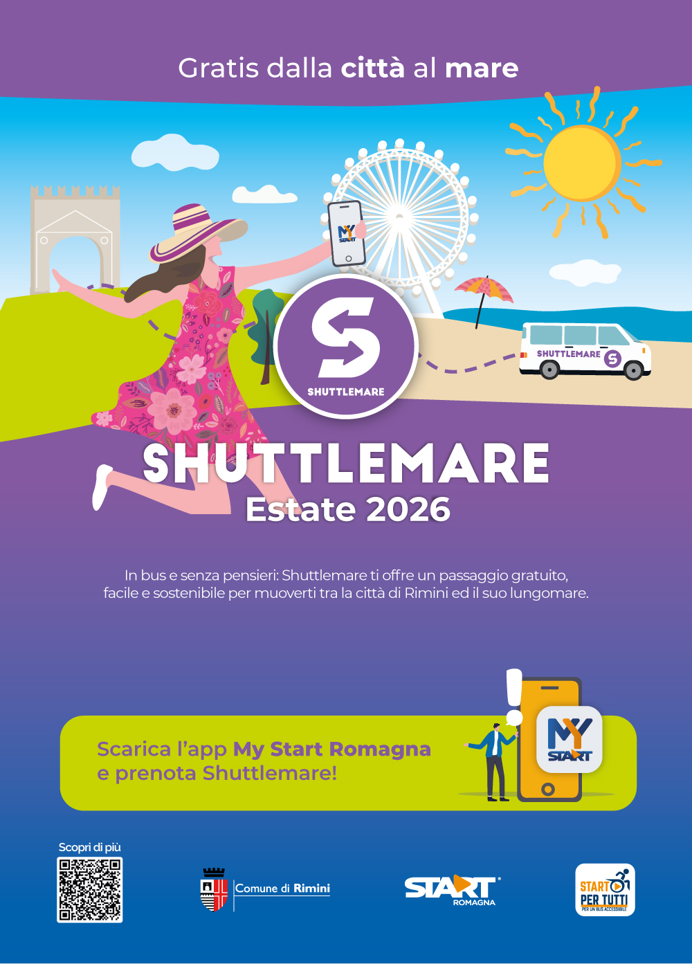 Scopri Shuttlemare, il servizio gratuito di collegamento in bus tra il centro città e il lungomare di Rimini. Una soluzione semplice, sostenibile e comoda per raggiungere la spiaggia, spostarti tra le fermate abilitate e vivere Rimini in libertà.
