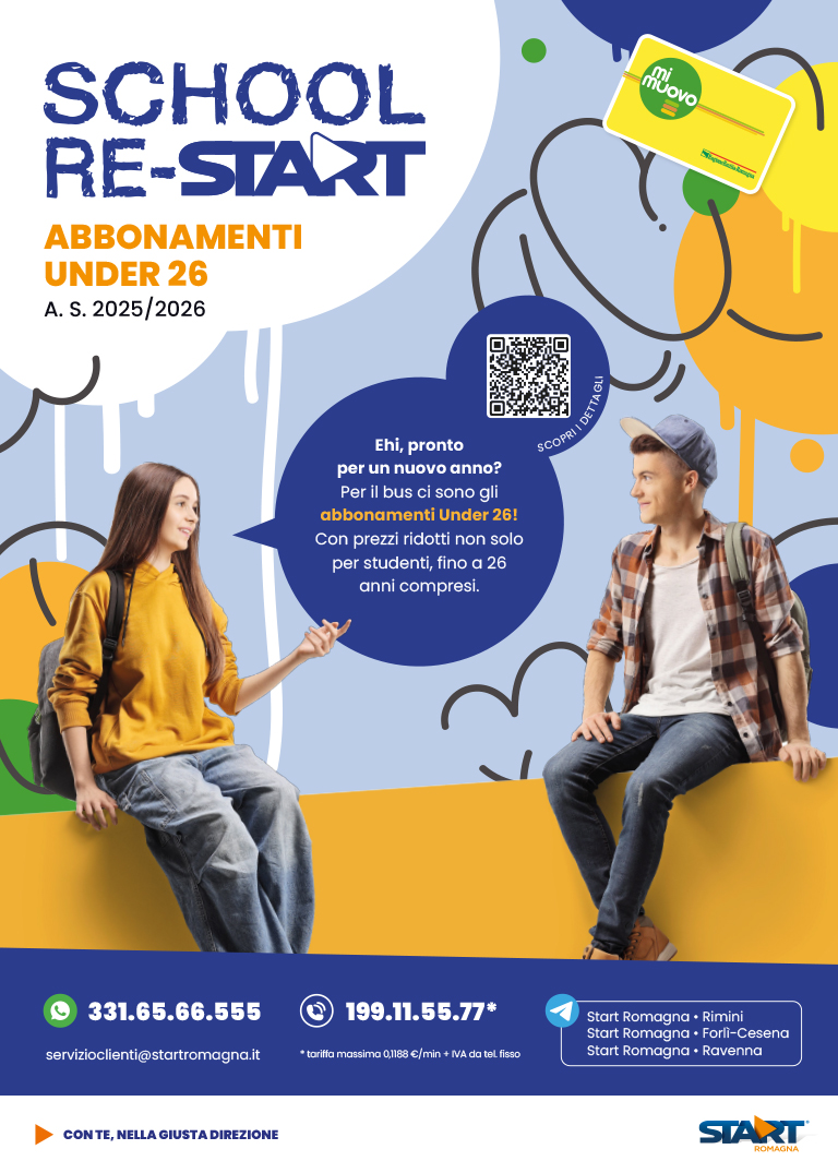 Scegli uno dei Punto Bus Start Romagna abilitati all’emissione di abbonamenti e porta con te una fototessera recente: riceverai la tua tessera Mi Muovo (costo 5,00 €, validità pluriennale) su cui sarà caricato l’abbonamento 2025-2026.